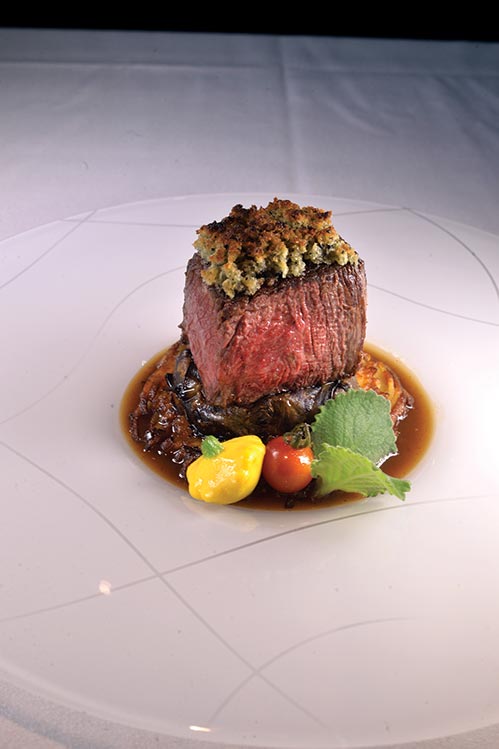 Commencer par dresser les croustillants, puis les charlottes et enfin le filet de bœuf gratiné et saucer.