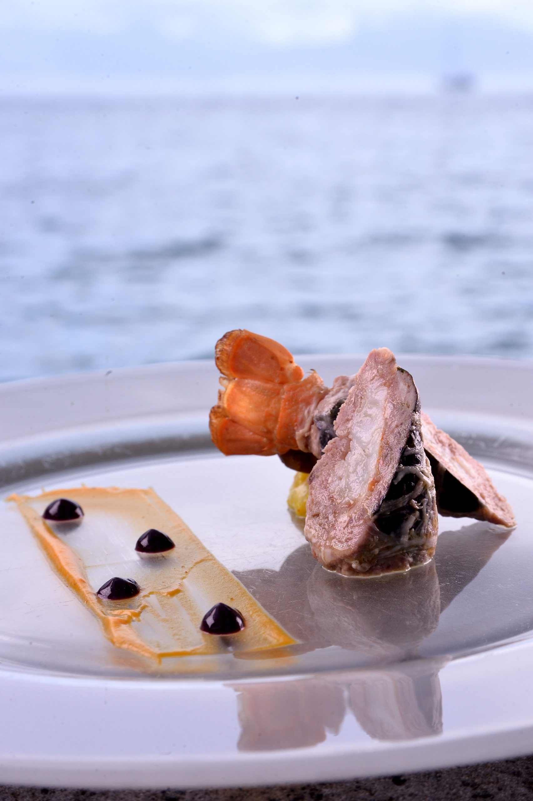 Dans de grandes assiettes, disposer suivant votre goût les paupiettes, les ½ cèpes. Finir la décoration avec la purée de potiron, la marmelade de fe'i, le caramel de jus de carotte.